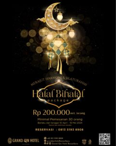 Dengan Halal Bihalal Package Bertema “Menjalin Harmoni & Silaturahmi”, Grand Qin Hotel Banjarbaru akan membantu anda untuk menyiapkan menu, pelayanan dan tempat terbaik. Dengan harga Rp 200.000,-/pax, anda bisa bersilaturahmi bersama orang terdekat dengan nuansa islami dan megah ala Madinah. Promo ini berlaku mulai dari tanggal 10 April – 10 Mei 2024.