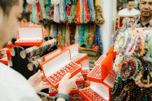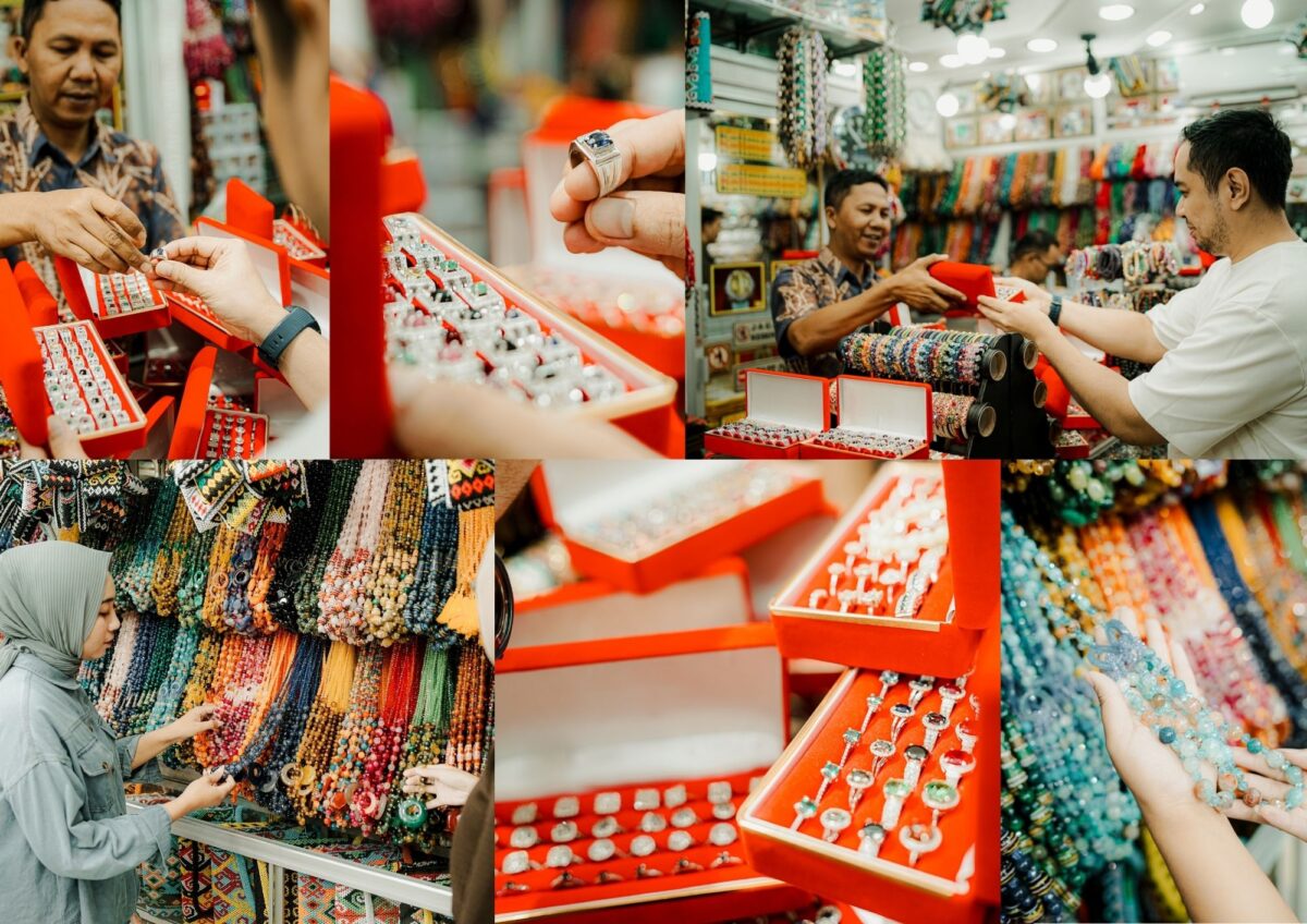 Begitu Anda melangkah masuk, Anda akan disambut oleh harmoni warna dari ribuan koleksi perhiasan. Bayangkan jemari Anda menyentuh dinginnya Intan Martapura yang dipotong dengan presisi sempurna, atau melihat pantulan cahaya dari deretan batu Kecubung, Akik, dan Zamrud yang memanjakan mata. Tak hanya batu mulia, Toko Kalimantan’s adalah “surga” bagi pecinta aksesori etnik. Anda akan menemukan kalung manik khas Dayak yang artistik hingga bros-bros perak dengan desain rumit yang dikerjakan tangan-tangan terampil pengrajin lokal.