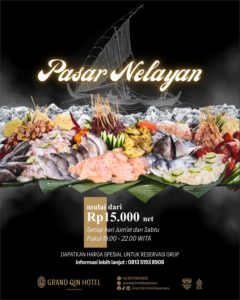 Suasana yang santai, tempat yang nyaman, pelayanan yang ramah, cita rasa ragam sari laut yang nikmat, beragam menu dan rasa saus yang bisa dipilih sepuasnya ditemani orang terdekat akan menyenangkan. Hal inilah yang ditawarkan Grand Qin Hotel Banjarbaru melalui promo spesial “Pasar Nelayan” yang hadir setiap Jum’at dan Sabtu malam di area Tanuhi Pool Terrace Grand Qin Hotel Banjarbaru.